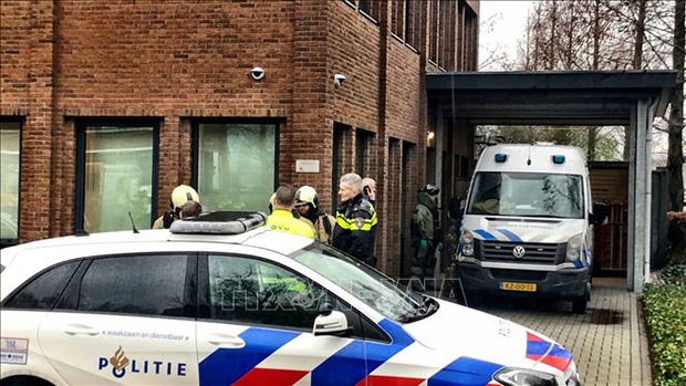 Cảnh sát được khai triển tại văn phòng của Công ty công nghệ thông báo Unisys ở Leusden, ngày 13/2/2020. Ảnh: NOS/TTXVN